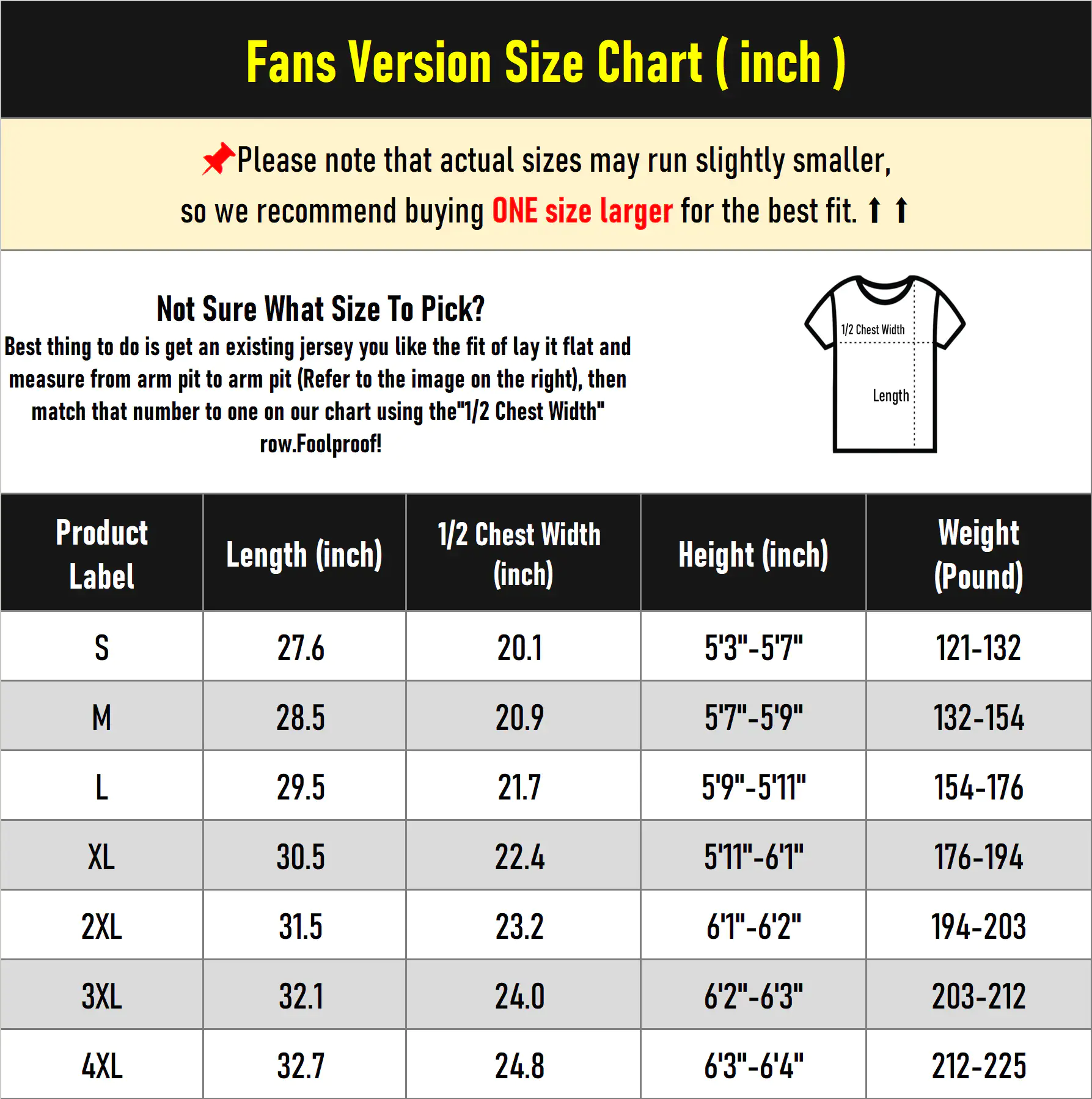 Please note that due to measurement errors, there may be a 1-2 inch discrepancy between the actual jersey size and the size chart, which is considered normal. If your measurements fall between two sizes or if you are overweight or have a muscular build, we highly recommend purchasing a larger size to ensure a more comfortable fit and better wearing experience.