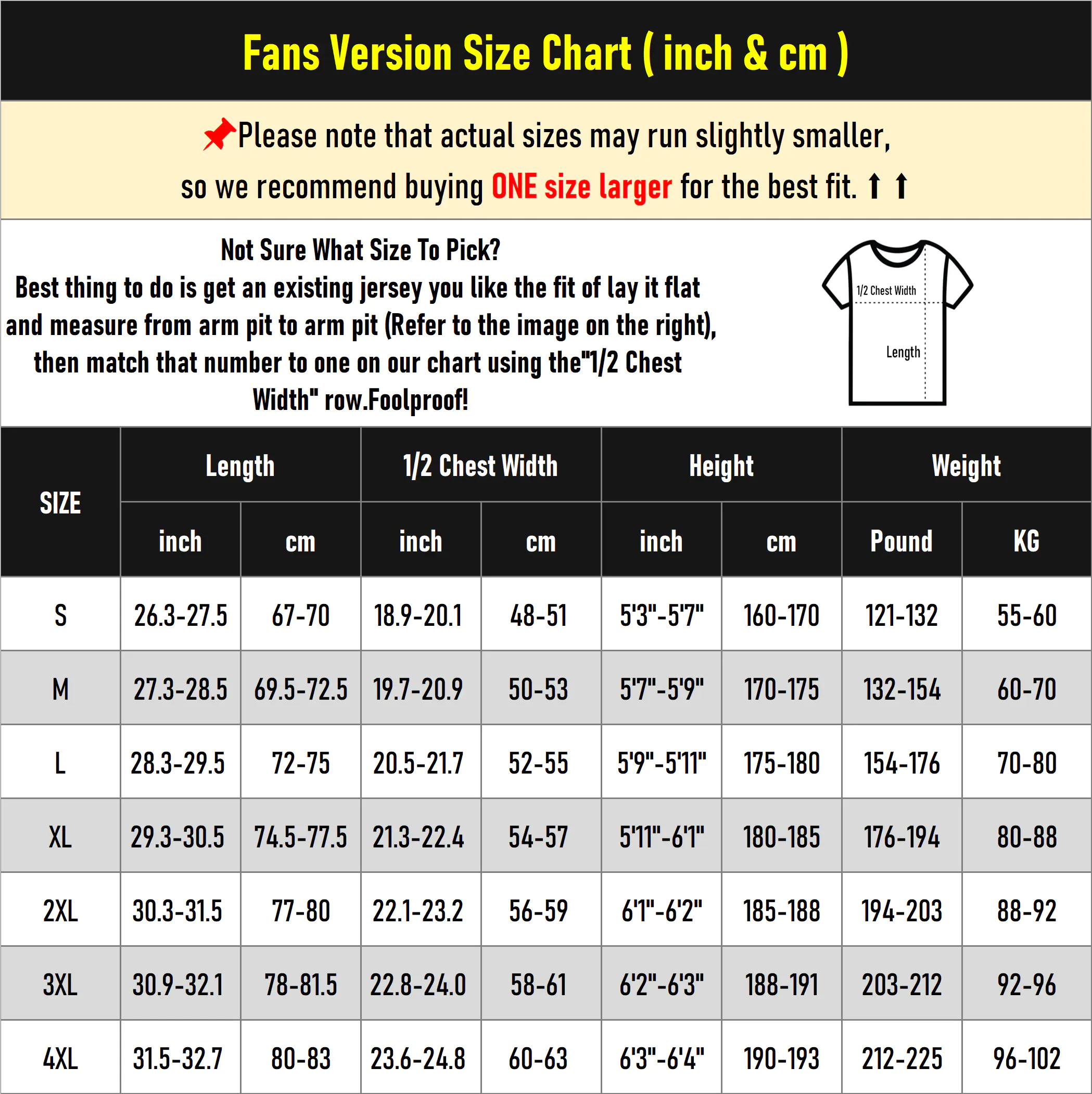 Please note that due to measurement errors, there may be a 1-2 inch discrepancy between the actual jersey size and the size chart, which is considered normal. If your measurements fall between two sizes or if you are overweight or have a muscular build, we highly recommend purchasing a larger size to ensure a more comfortable fit and better wearing experience.